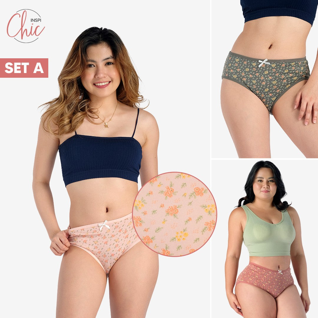 INSPI Chic 3pcs Panty for Women Plus Size or Regular Set Ribbon Printed or Plain Cotton Underwear for Woman Set A