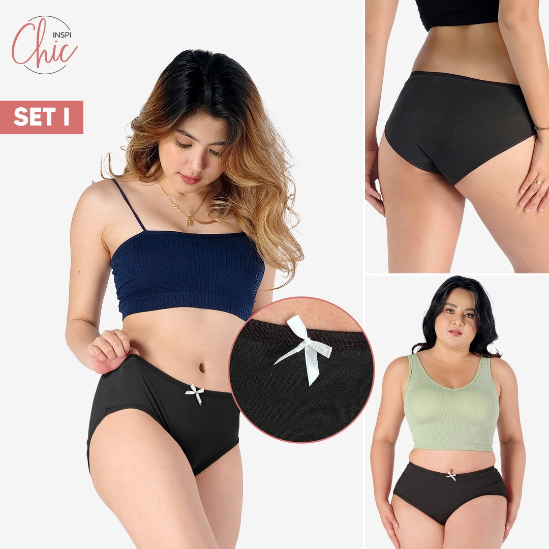 INSPI Chic 3pcs Panty for Women Plus Size or Regular Set Ribbon Printed or Plain Cotton Underwear for Woman Set I