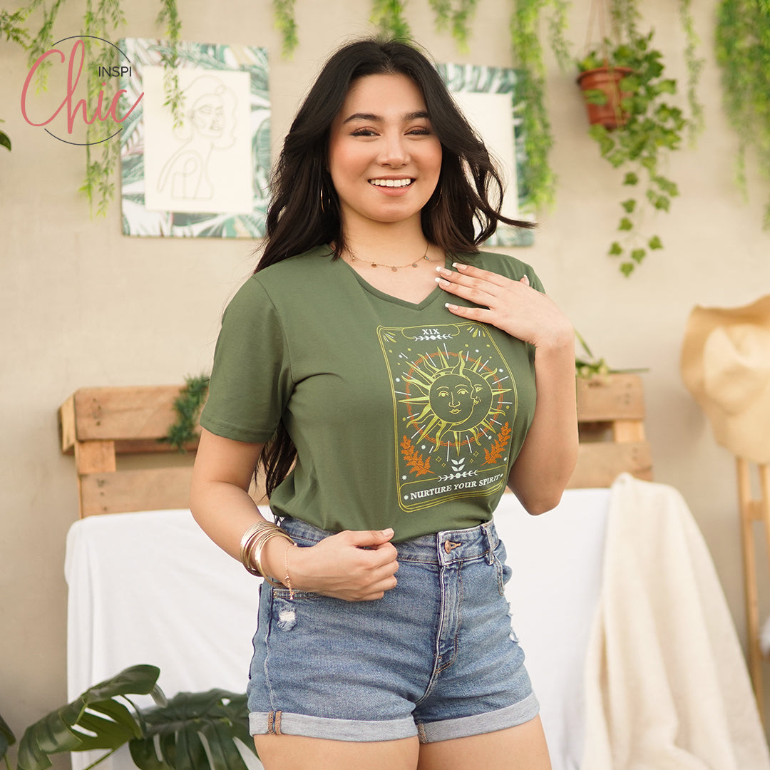 INSPI Chic Nurture Your Spirit V Neck Tshirt For Women Mystical Graphic Tees Cotton Trendy T Shirt