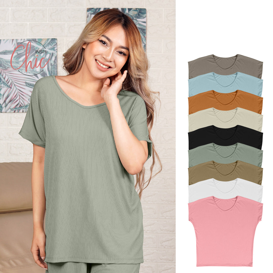 INSPI Chic Plain Ribbed Drape Comfortable Tshirt for Women Rib Knitted Basic Round Neck Blouse Casual Cotton Shirts for Women