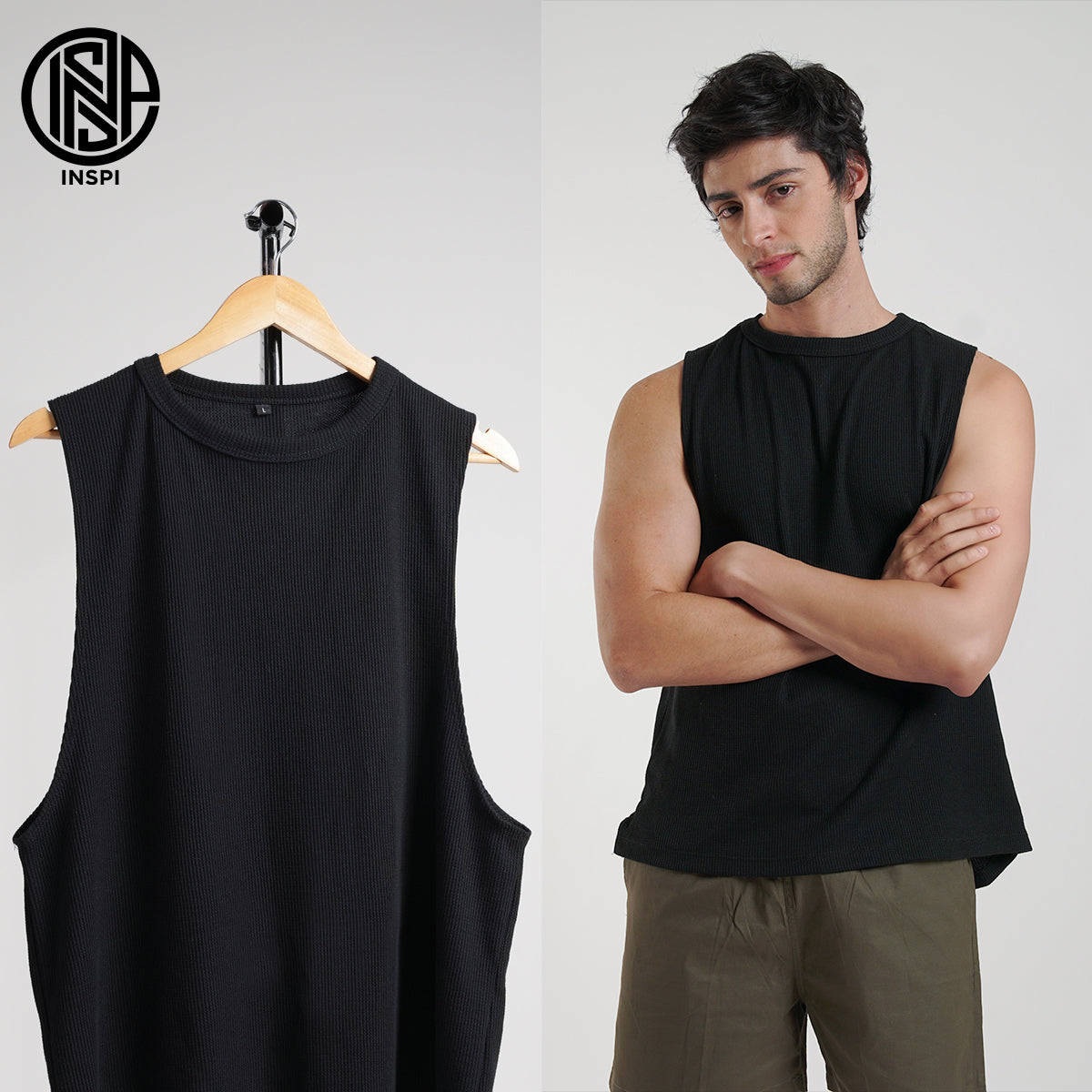 INSPI Waffle Muscle Tee Black Sando for Men Plain Sleeveless Tank Top Gym Workout Exercise Beach Outfit